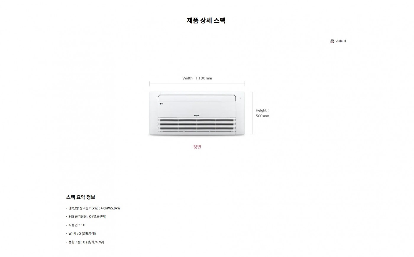 냉/난방 정격능력(kW) : 4.0kW/5.0kW365 공기청정 : O (별도구매)자동건조 : OWi-Fi : O (별도구매)풍향조절 : O (상/하/좌/우)